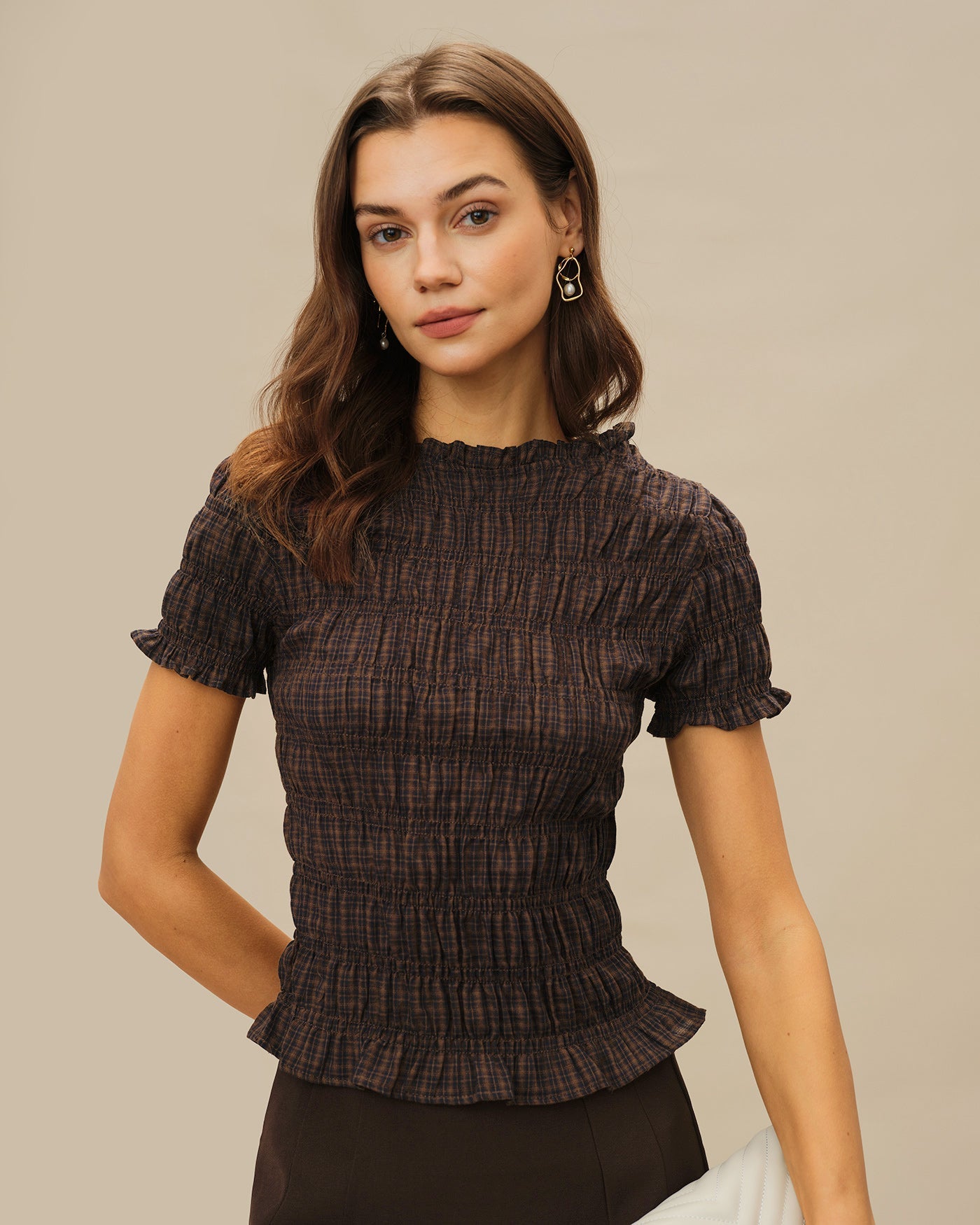 Coffee Plaid Shirred Tee